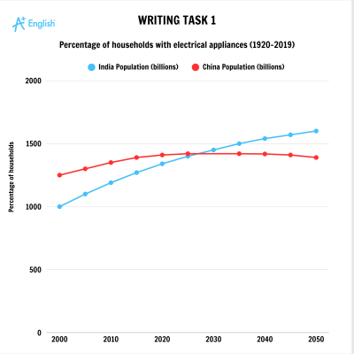 “Biểu đồ dưới đây cho thấy dân số của Ấn Độ và Trung Quốc từ năm 2000 đến nay với dự đoán tăng trưởng đến năm 2050.Tóm tắt thông tin bằng cách chọn và báo cáo các tính năng chính và so sánh nếu có liên quan”