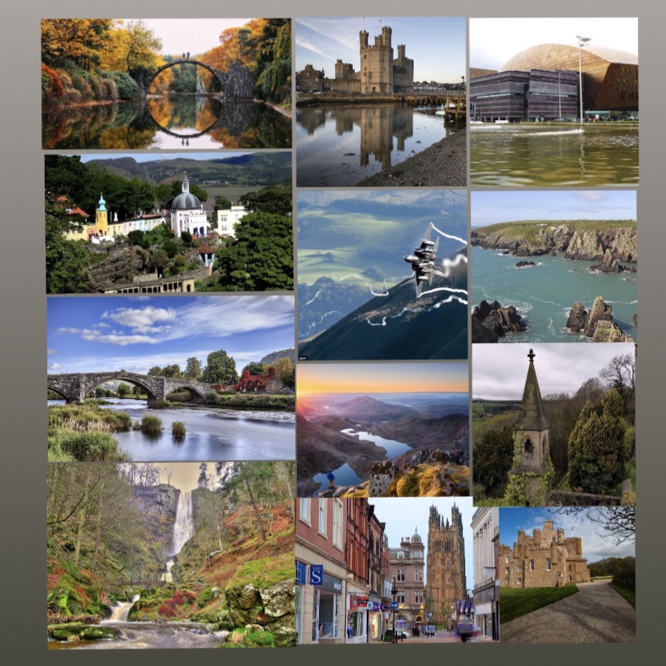 All are in the north of Wales, including Snowdon (the highest mountain), Gresford Bells (the bells on an old church in All Saints, Gresford), Llangollen Bridge in Flintshire, Wrexham Steeple, the aquatic plants Overton, and Pistyll Rhaeadr waterfall.